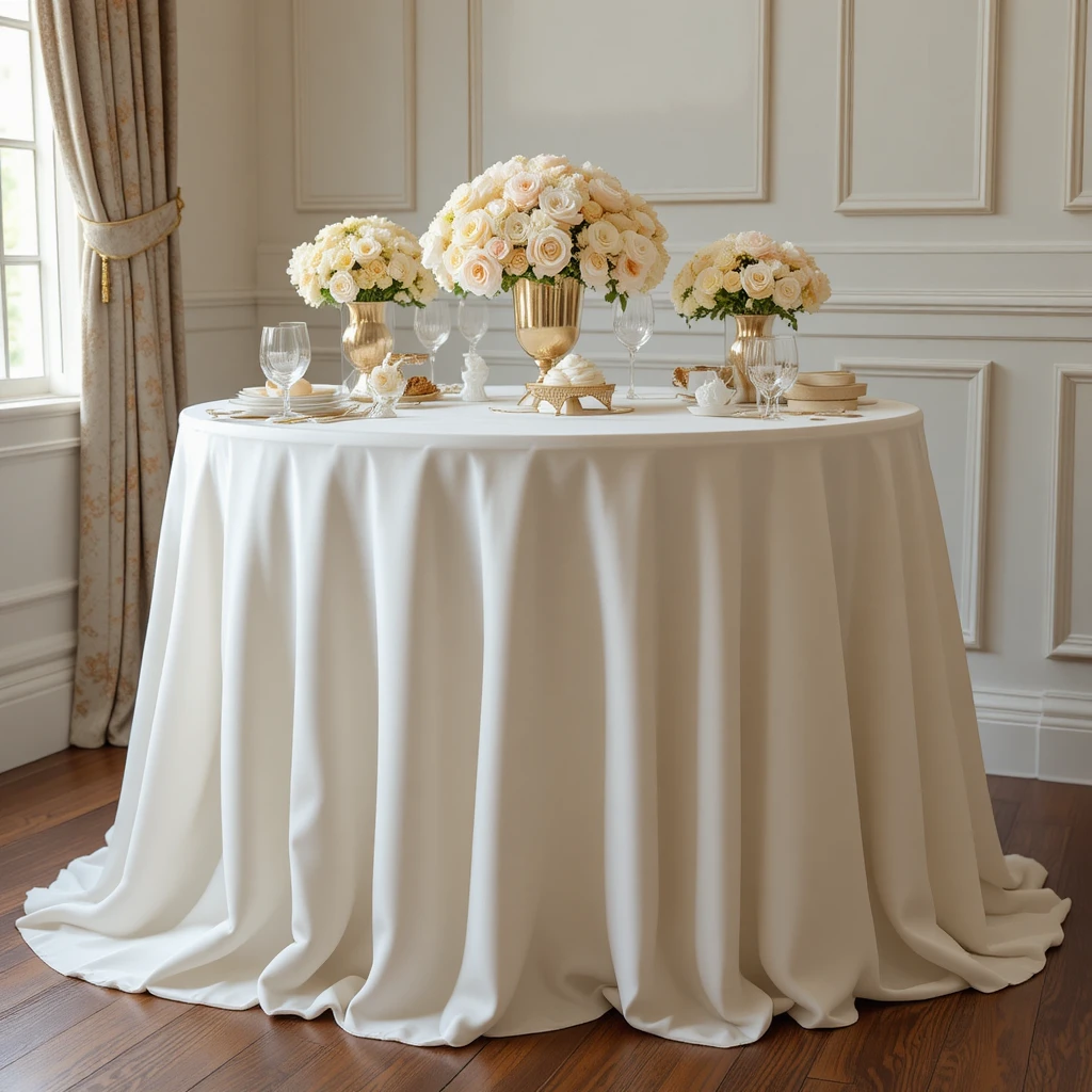 Nothing says timeless elegance like a white and gold sweet table. Use a crisp white tablecloth or runner as your base, then layer gold chargers, cake stands of varying heights, and metallic trays. Add white roses, eucalyptus, and touches of gold ribbon or confetti for shimmer.