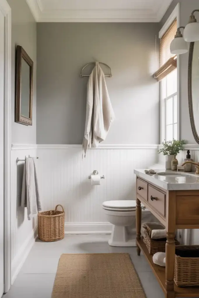 For a timeless combination, pair white wainscoting with neutral wall colors like soft gray, beige, or even pastel tones. This versatile look complements everything from farmhouse bathrooms to modern spa-like retreats.