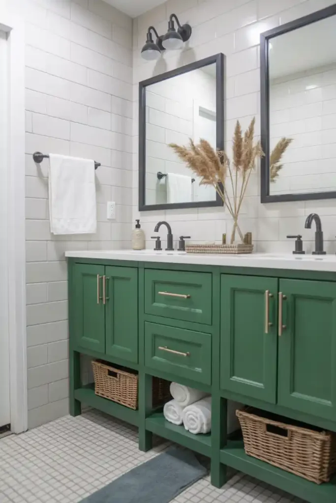 Deep navy, forest green, or even matte black can instantly create a luxurious contrast against crisp white wainscoting. The two-tone effect makes the bathroom feel more intentional and designer-approved, even on a budget.