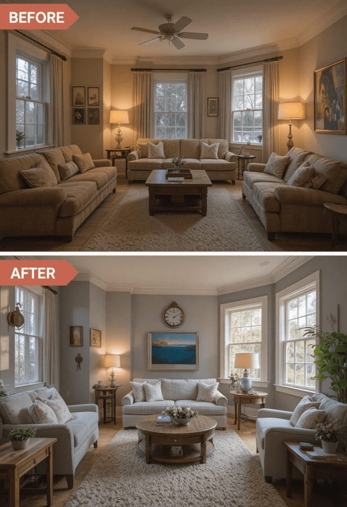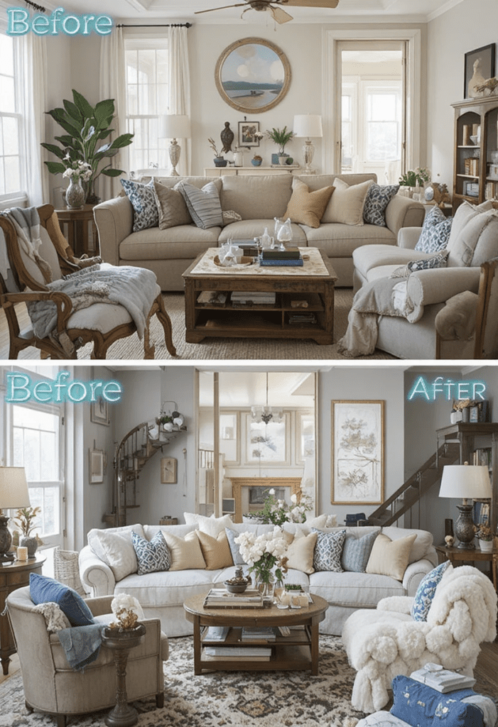 In the “after” transformation, furniture is not just about filling space it’s about comfort and balance. Soft sofas, cozy chairs, cushions, and throws add instant warmth. Furniture placement should encourage relaxation and conversation rather than blocking movement.