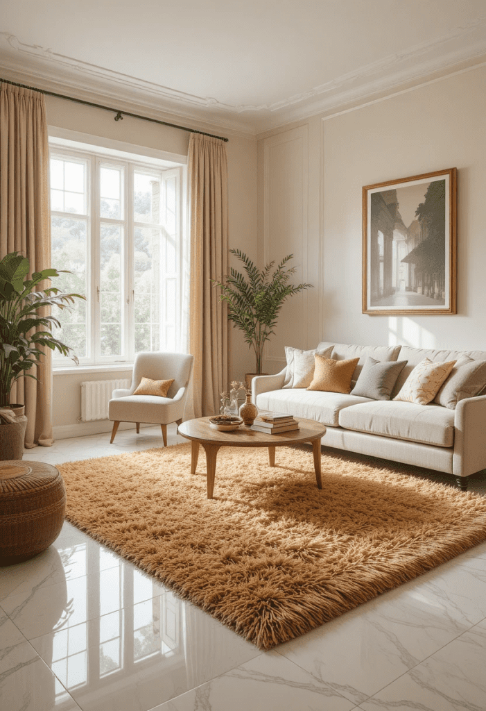 Clean, polished, or glossy floors reflect light and make the room feel brighter and more elegant. Adding a warm area rug on top balances shine with softness, creating the perfect cozy contrast.