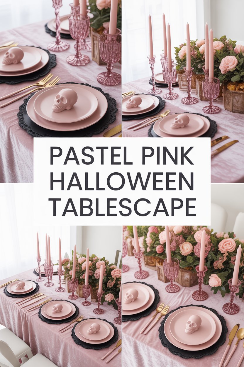 Hosting a Halloween dinner or party? Create an enchanting tablescape with pink velvet table runners, rose-gold cutlery, and black lace accents for a hint of darkness. Use pink candles in ornate holders, pastel floral arrangements, and skull-shaped dessert plates to keep the vibe spooky yet elegant. Pairing pink with black creates a perfect contrast that captures Halloween’s mysterious essence while staying delightfully chic.