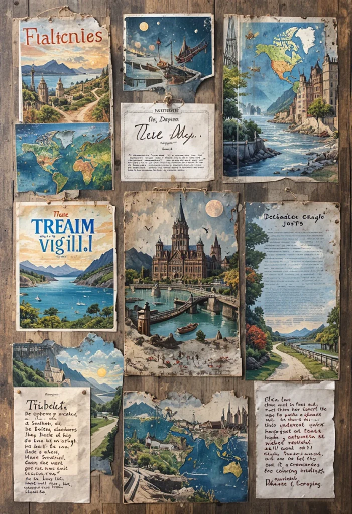- Textures and Mementos: Old boarding passes, foreign currency, or fabric scraps that evoke a specific place (like linen for the French Riviera).