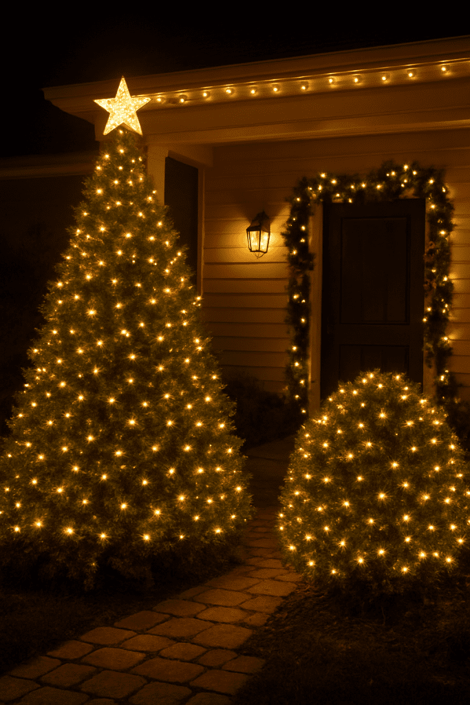 Mini LED net lights are ideal for bushes, while string lights create depth and sparkle for taller trees. Adding ornaments or ribbons gives a more complete and cohesive festive appearance.
