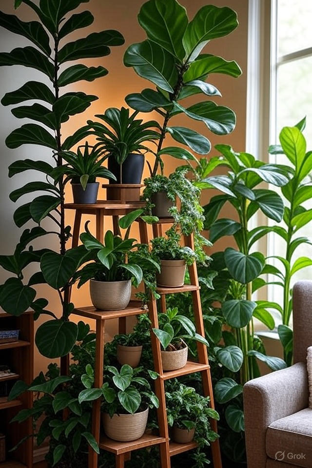 Placing plants of varying heights in one spot creates a mini indoor jungle without overwhelming the entire room. To enhance the effect, add a stylish plant stand or ladder shelf to display them at different levels.