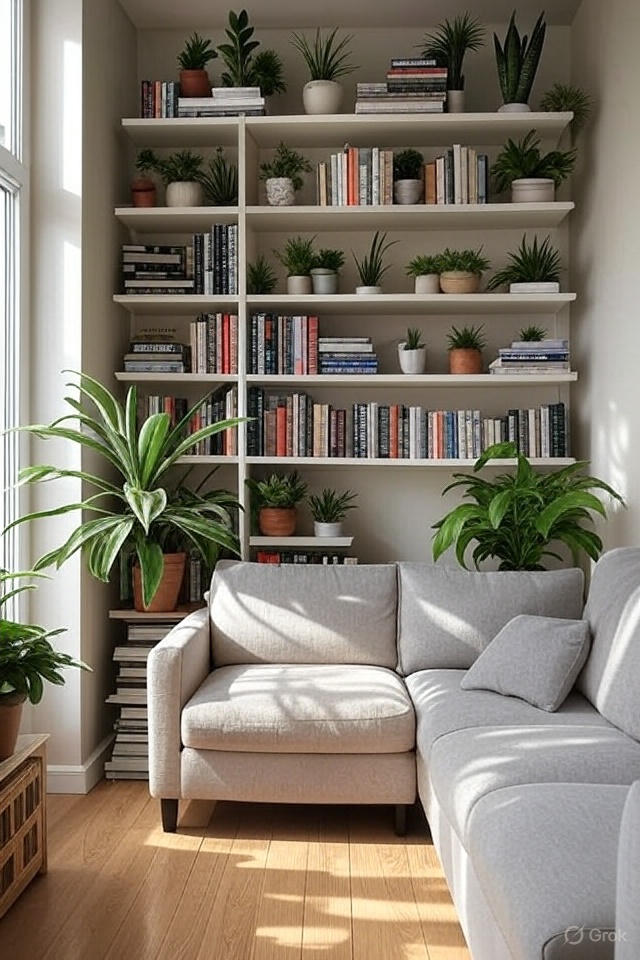 Adding plants to shelves also softens the straight lines of furniture, giving your room a more relaxed and inviting feel.