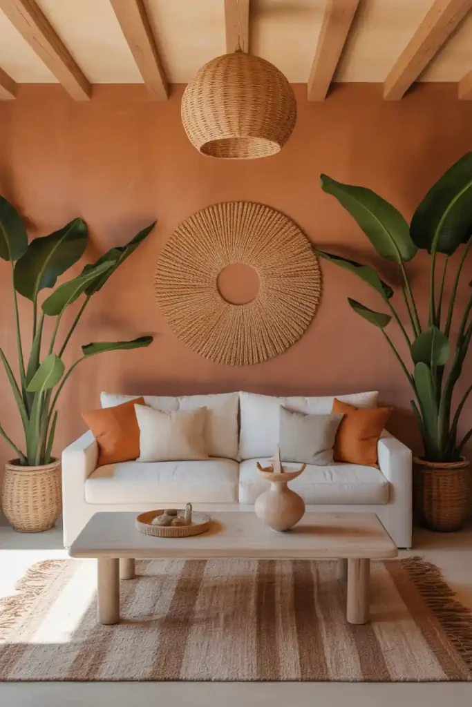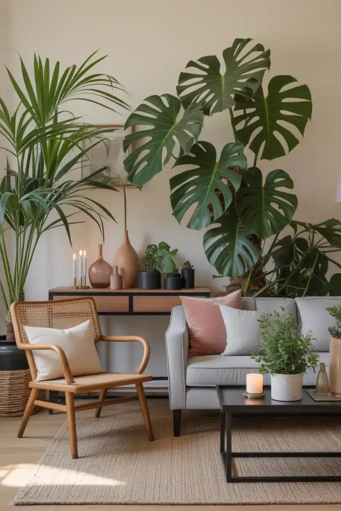 For a cohesive design, mix your plants with natural materials like wood, rattan, jute, or stone. A wicker basket holding a plant, a jute rug beneath greenery, or a wooden plant stand instantly ties the look together.