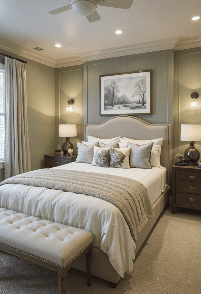 A sage green guest room feels thoughtful and inviting. The color creates a peaceful atmosphere that helps guests relax. Simple decor and soft lighting complete the look, similar to modern guest bedroom ideas.