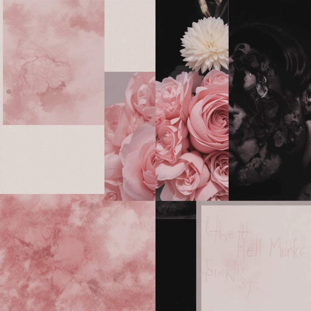 Start with a clean, airy foundation: blush pinks, creamy whites, and hints of champagne gold. Use delicate elements like handwritten love letters, single roses, heart-shaped polaroids, satin ribbons, and tiny gold jewelry pieces.