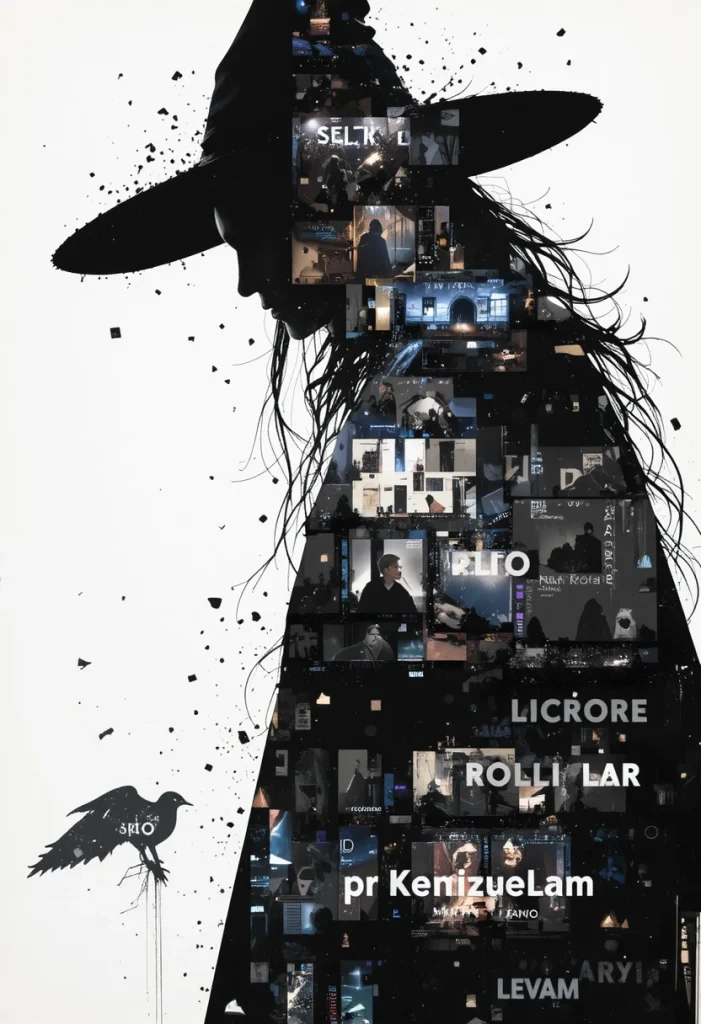 Mood: Black-and-white cinema, dramatic shadows, exaggerated expressions. Palette: Monochrome with pops of blood red. Key Elements: Pointy hat against a full moon, intertitle card reading “The Witching Hour.”